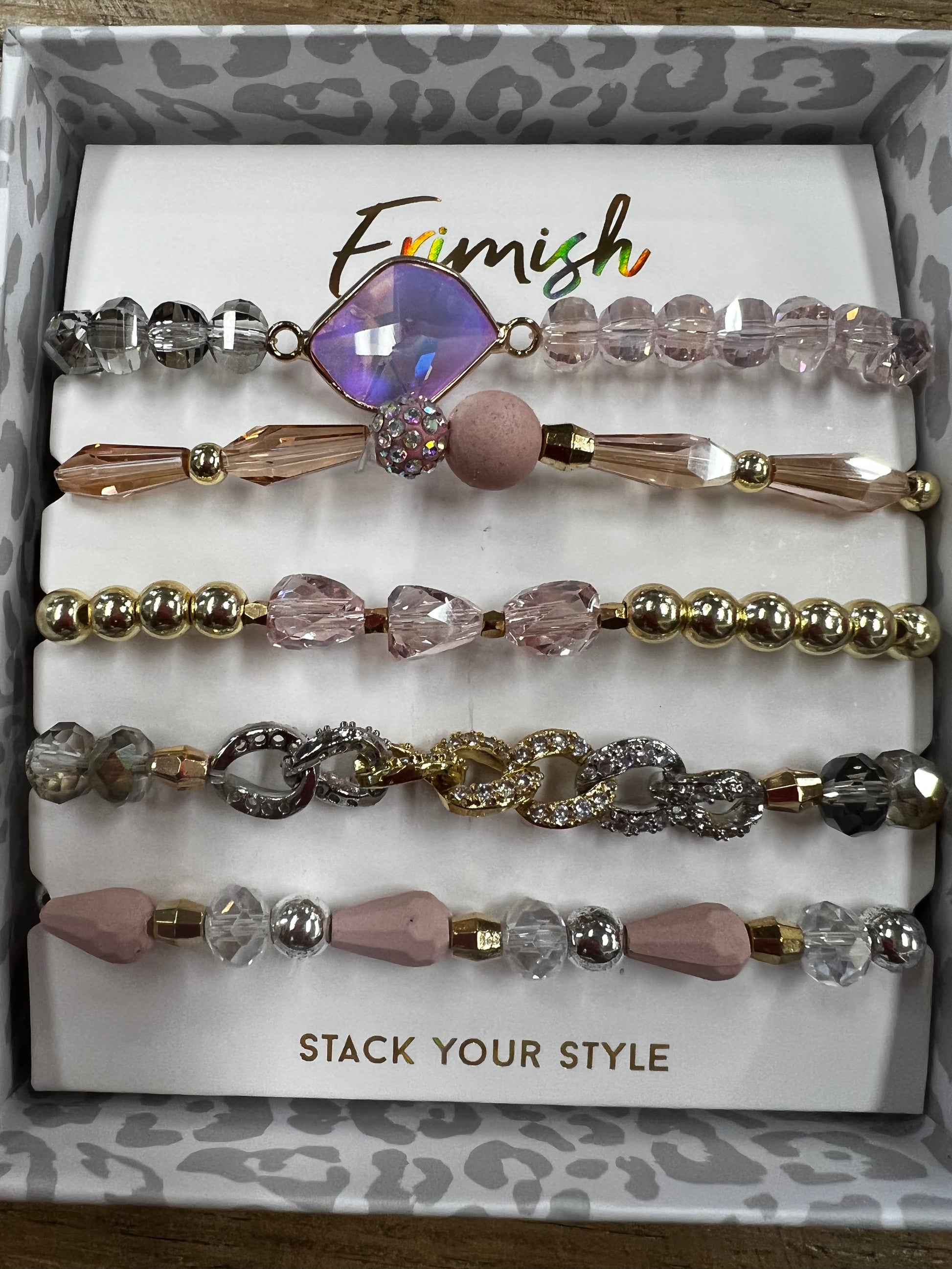 - This stack features a gorgeous combination of soft pink and gold-colored beads.
