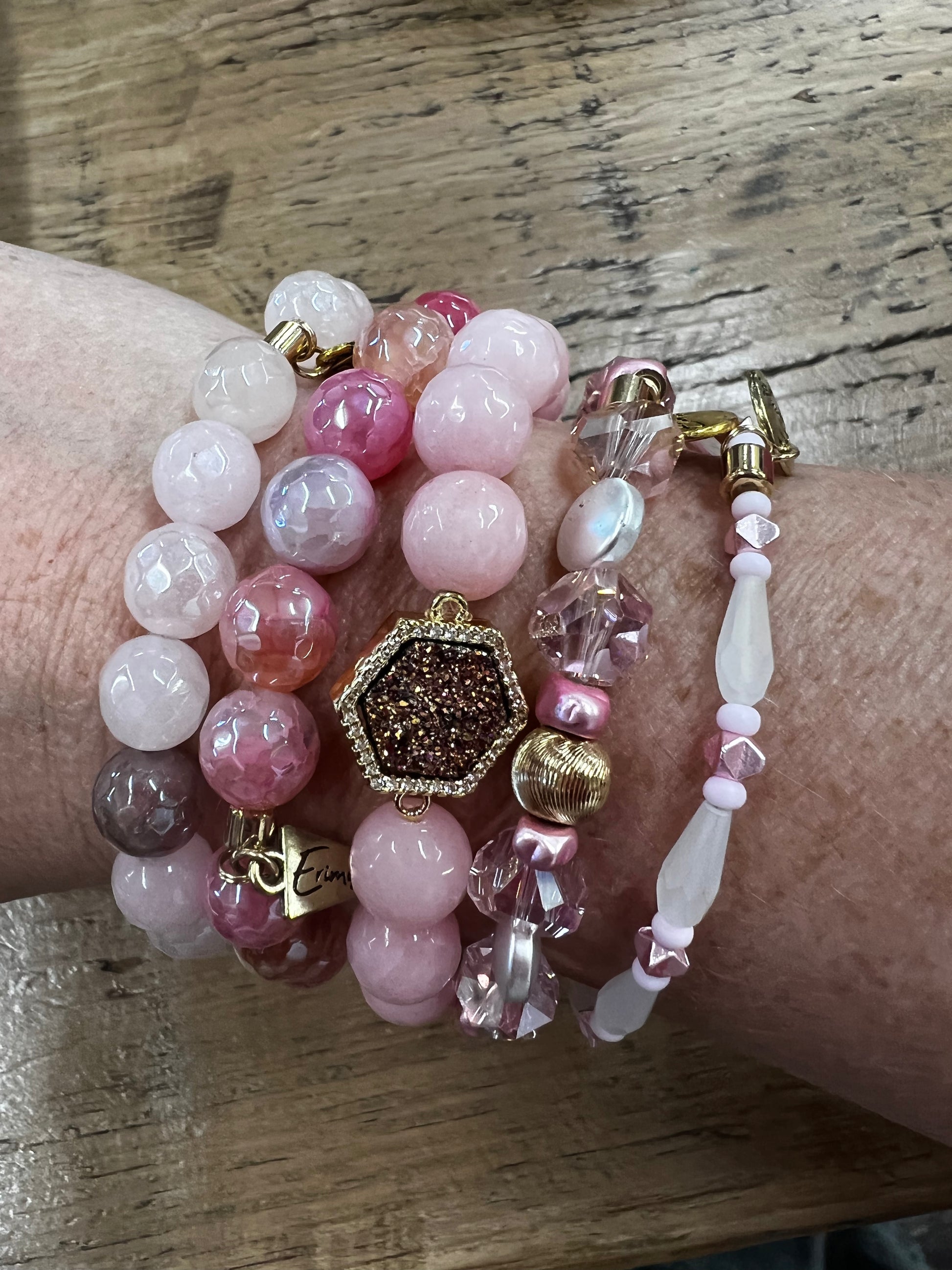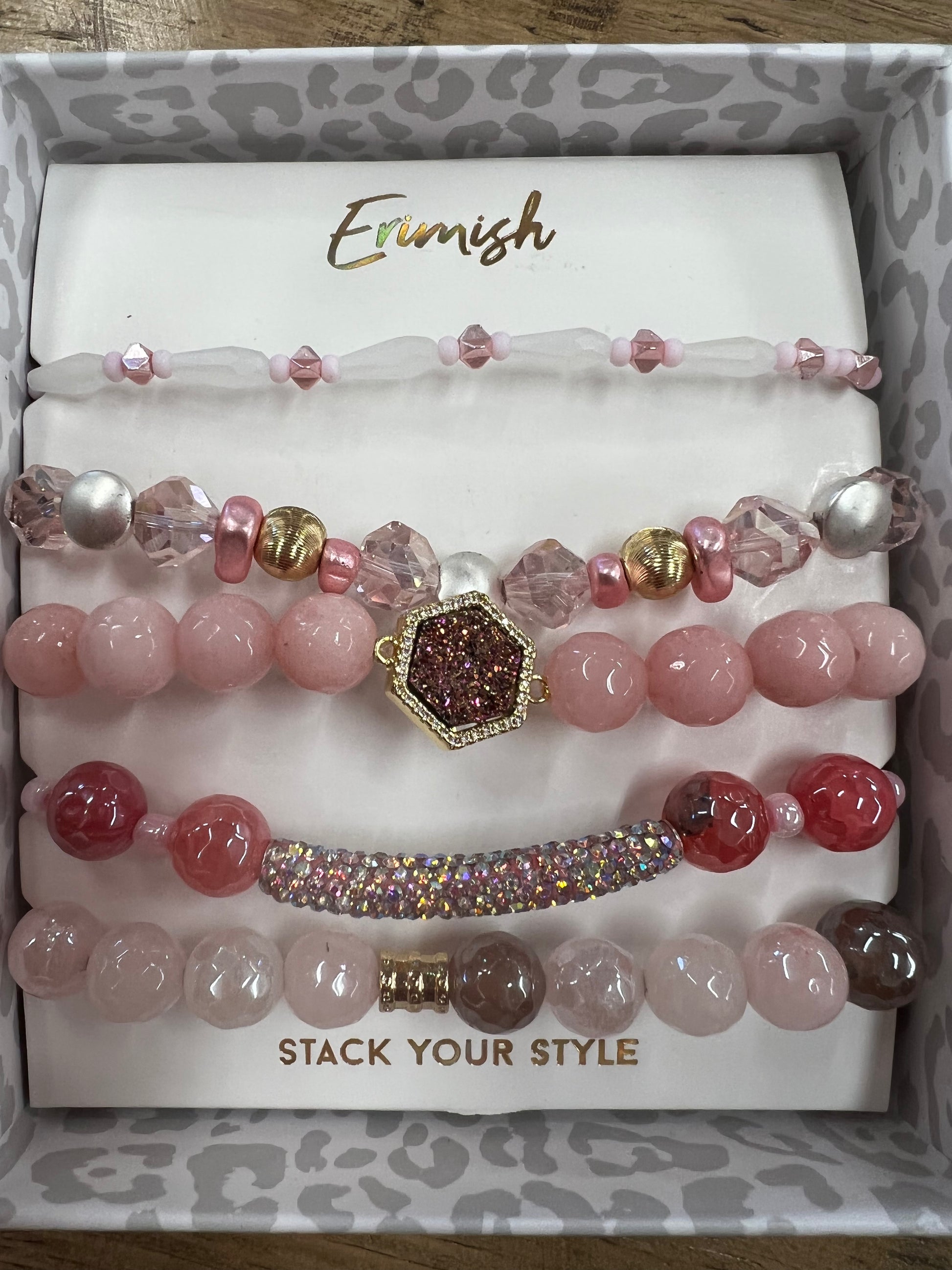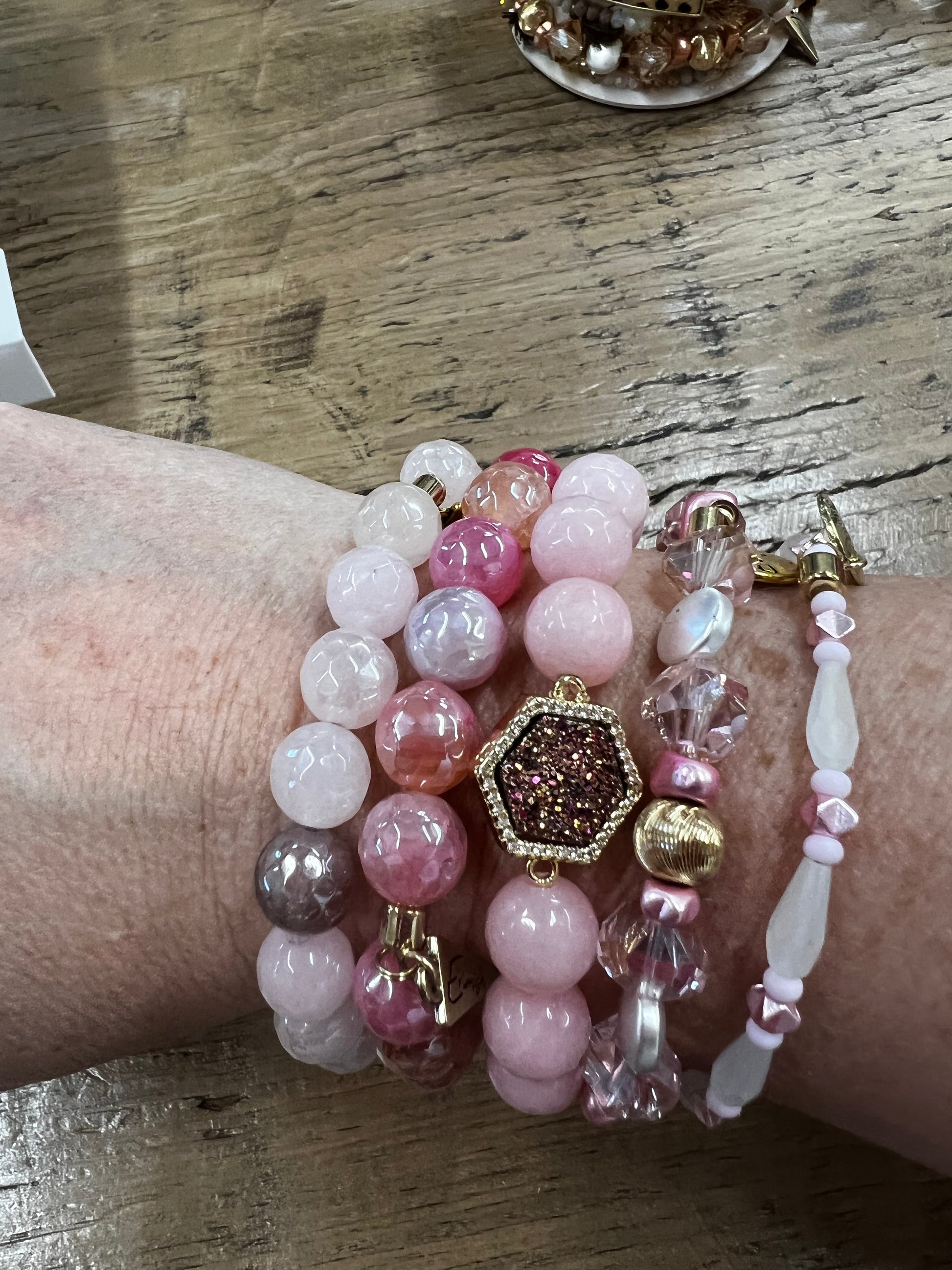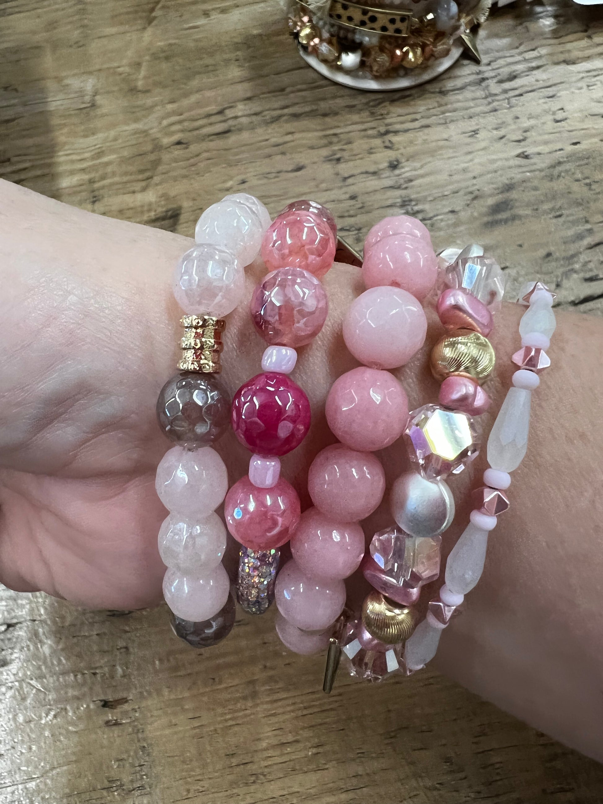 - Create a beautiful fall look with the five-piece Sundance Baby Pink beaded stretch bracelet stack. This stack features a combination of soft pink natural stone beads with gold accents and we added in a pop of shimmer with the pink rhinestone glitter bar.
