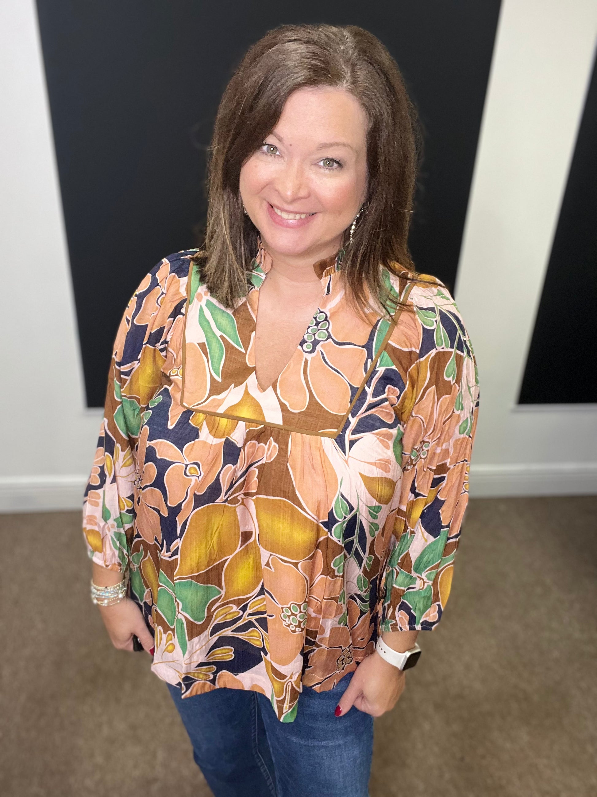 Abstract Floral Print Blouse with Ruffle Neck, Green