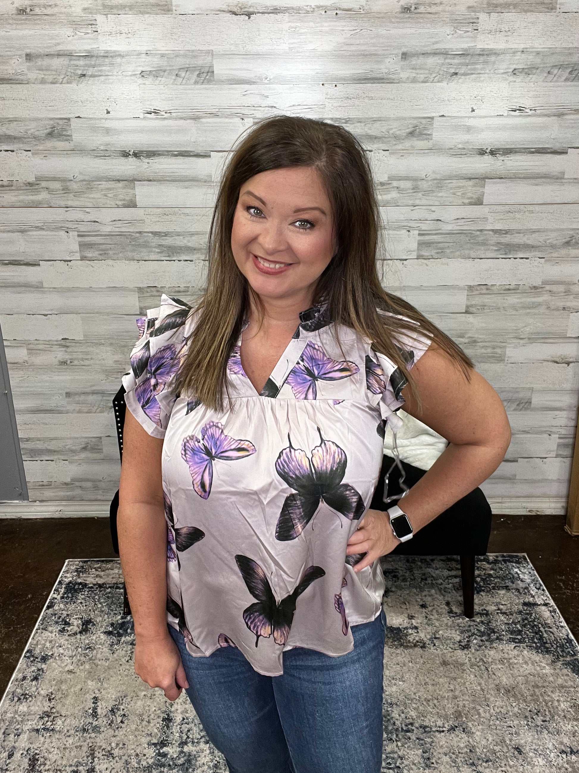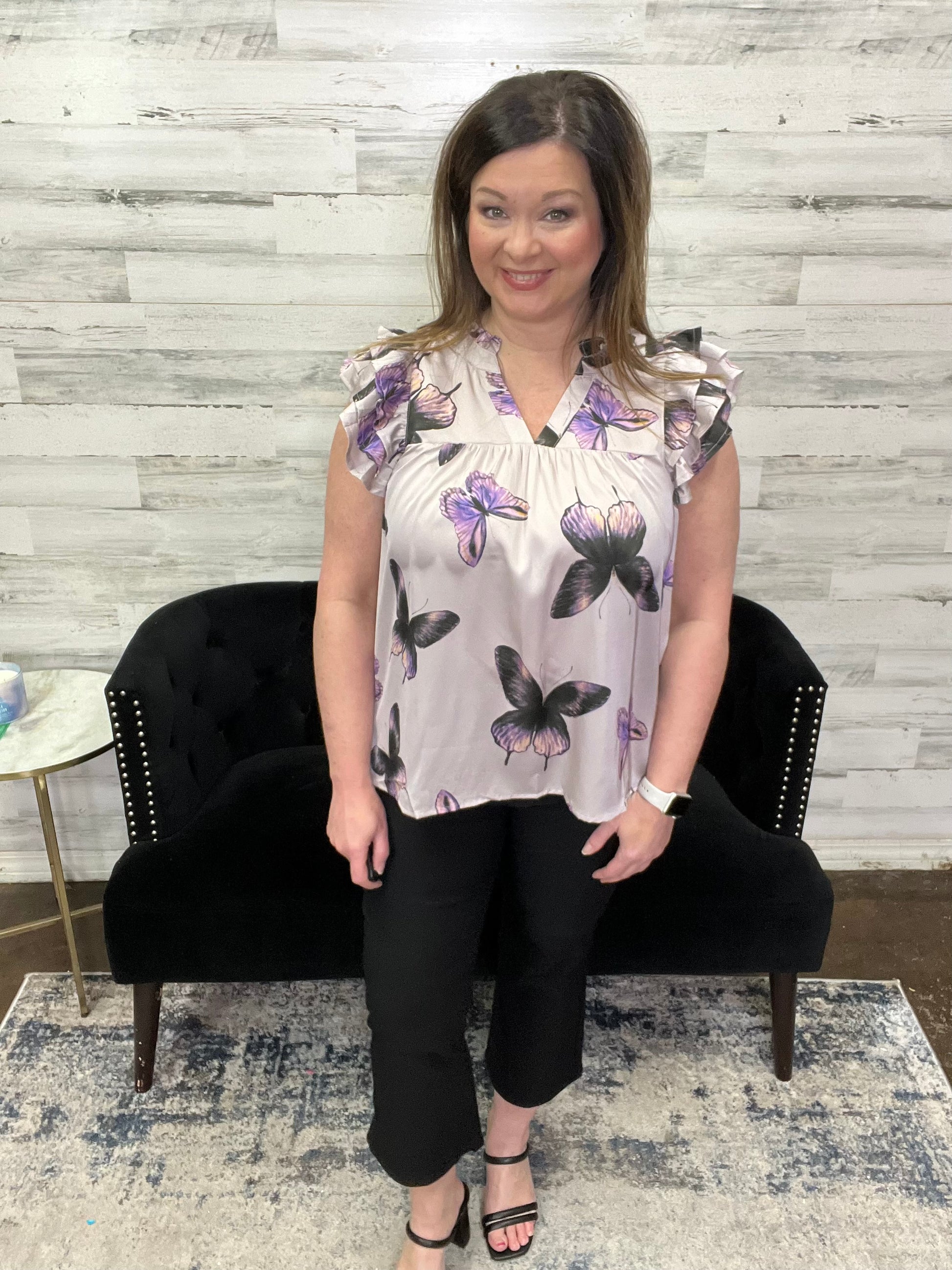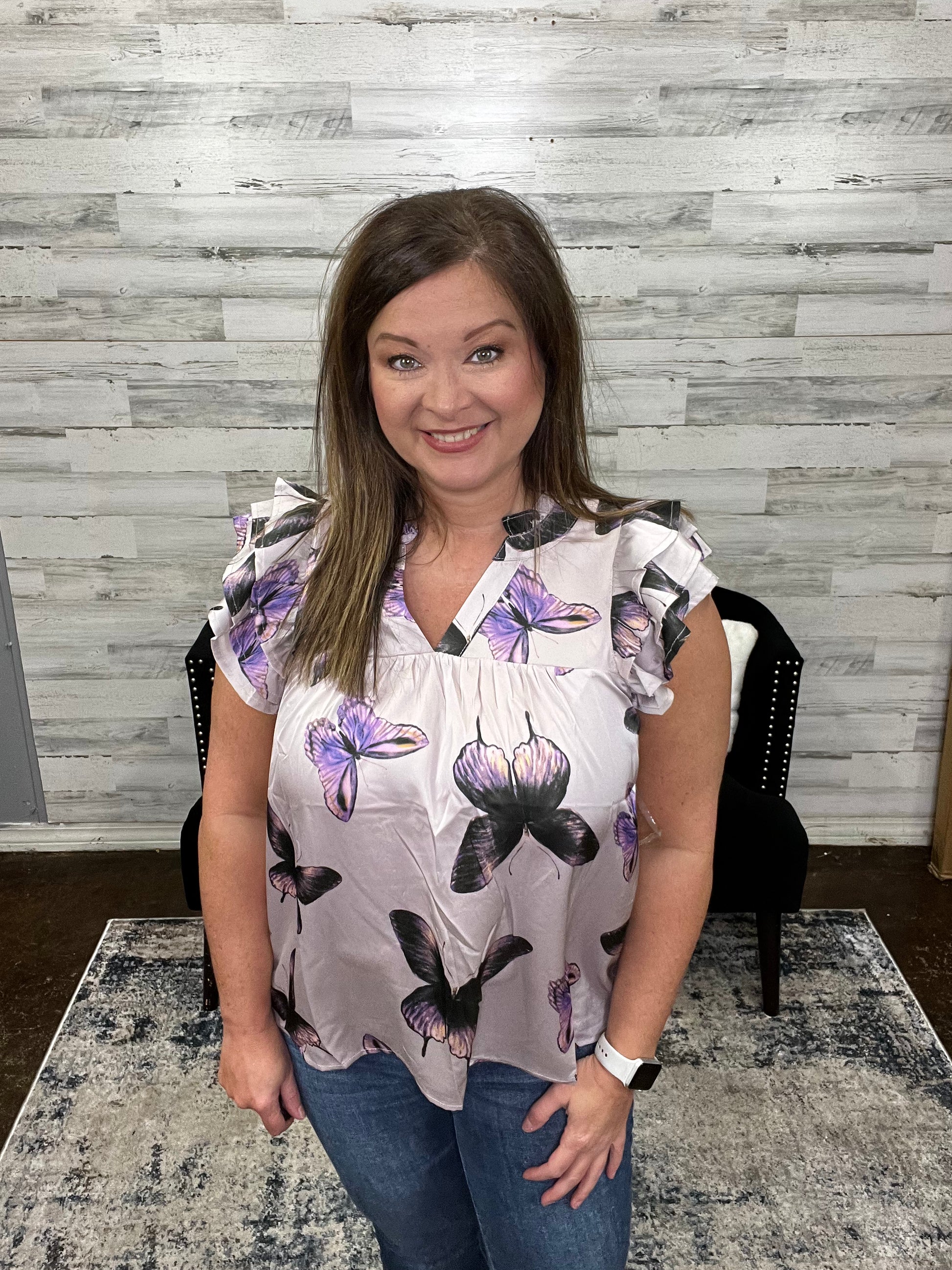 Slip into this cute butterfly-printed top and flutter about with frilly flair! The tiered ruffle sleeves give your look a flirty edge, while the v-neck and lightweight fabric keep you comfy and flyin' high. Perfect for a breezy day out!