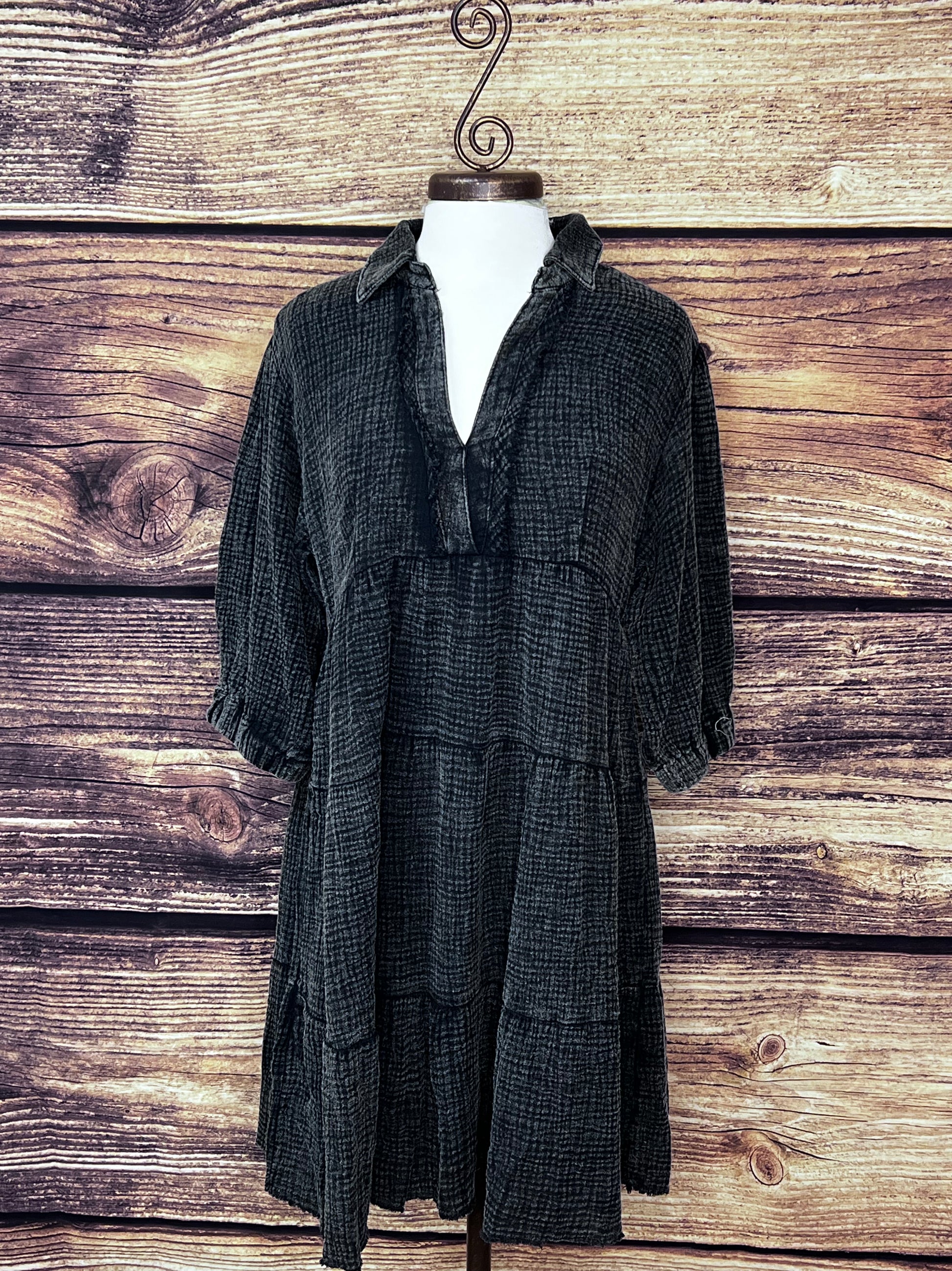 - Cotton gauze snow wash dress with unfinished frayed hem.