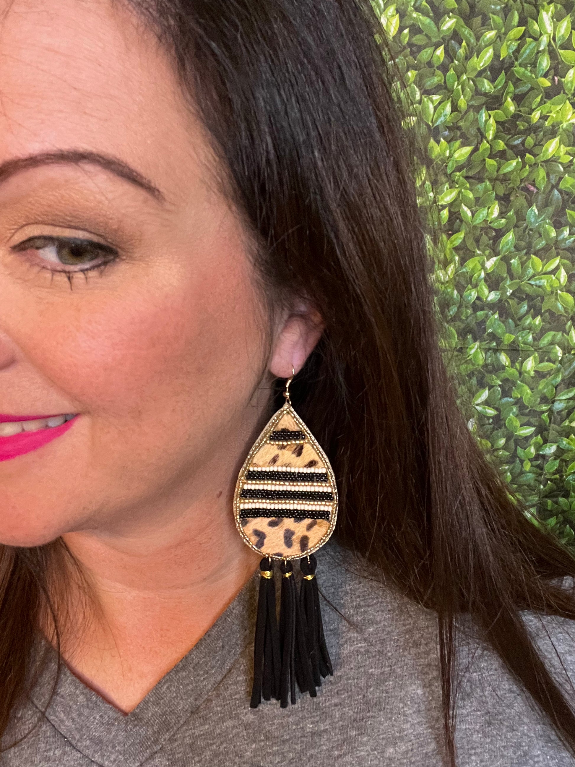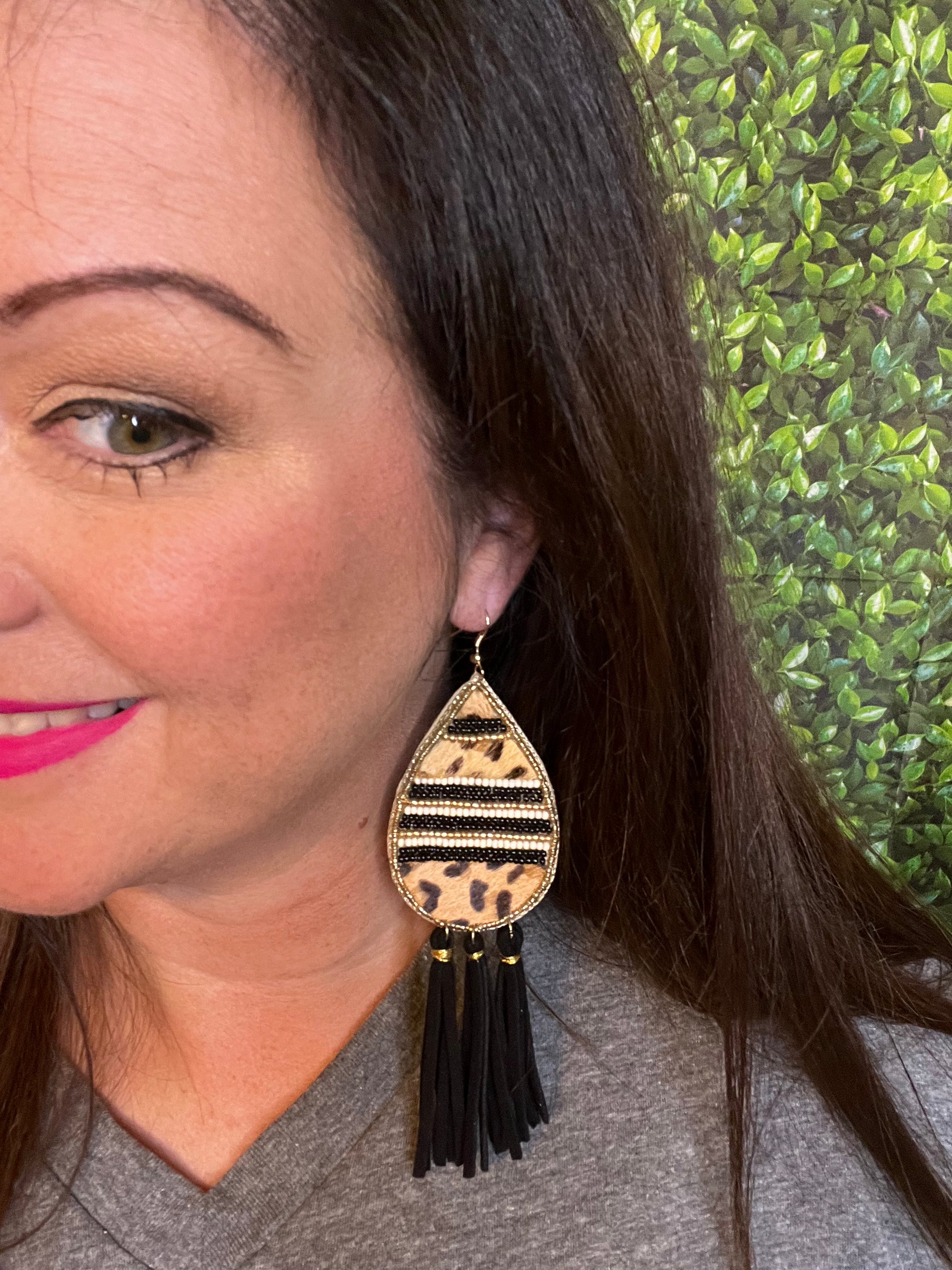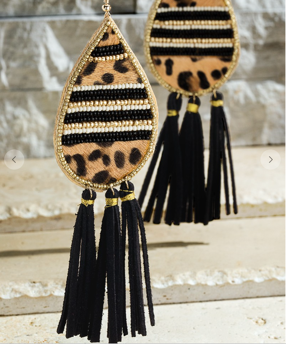 These adorable dangle teardrop dangle earrings are a faux leather animal print with seed beads and suede tassels. These are lightweight and perfect for everyday wear. Hurry and make these earrings yours they won't last long.