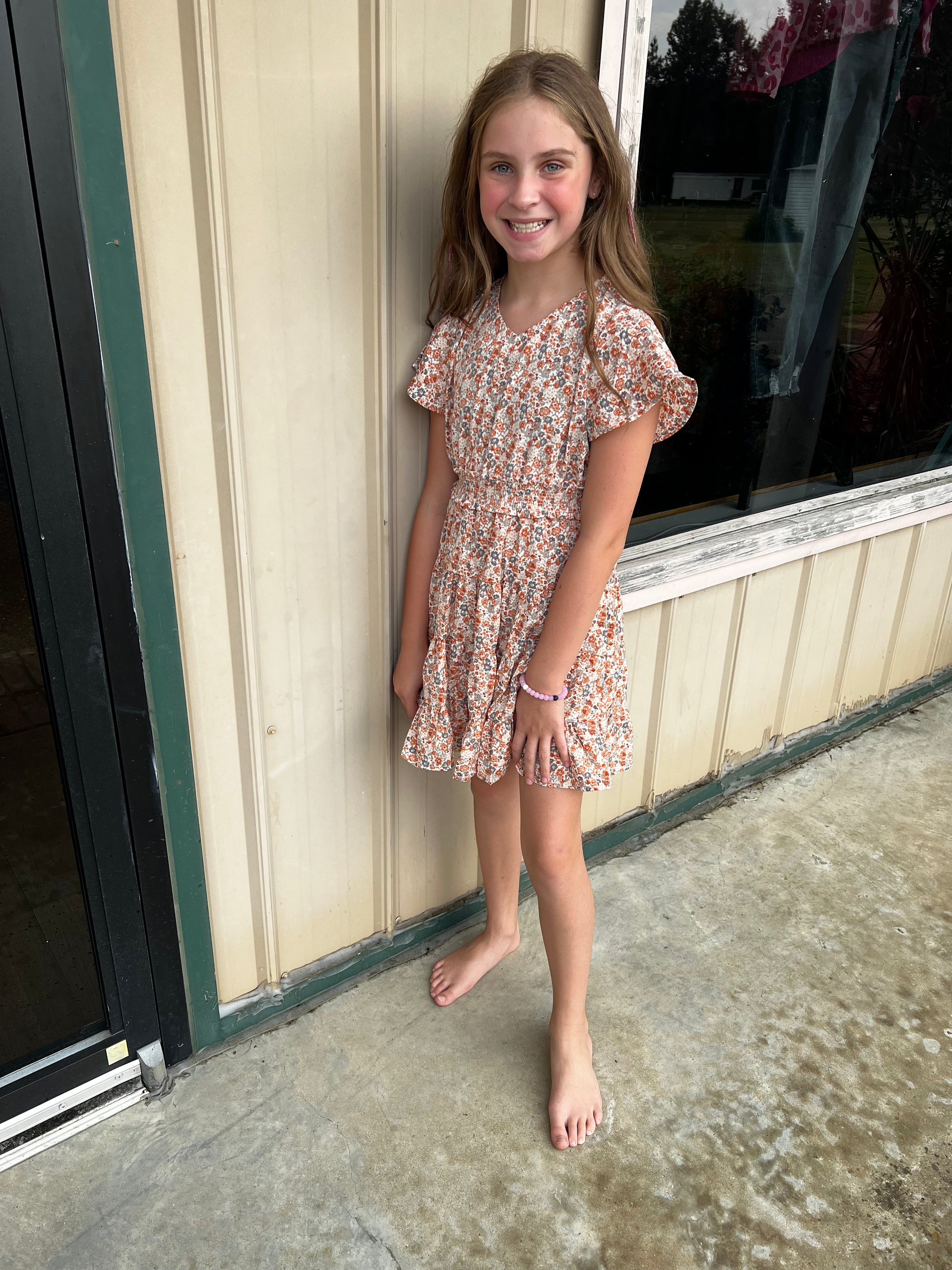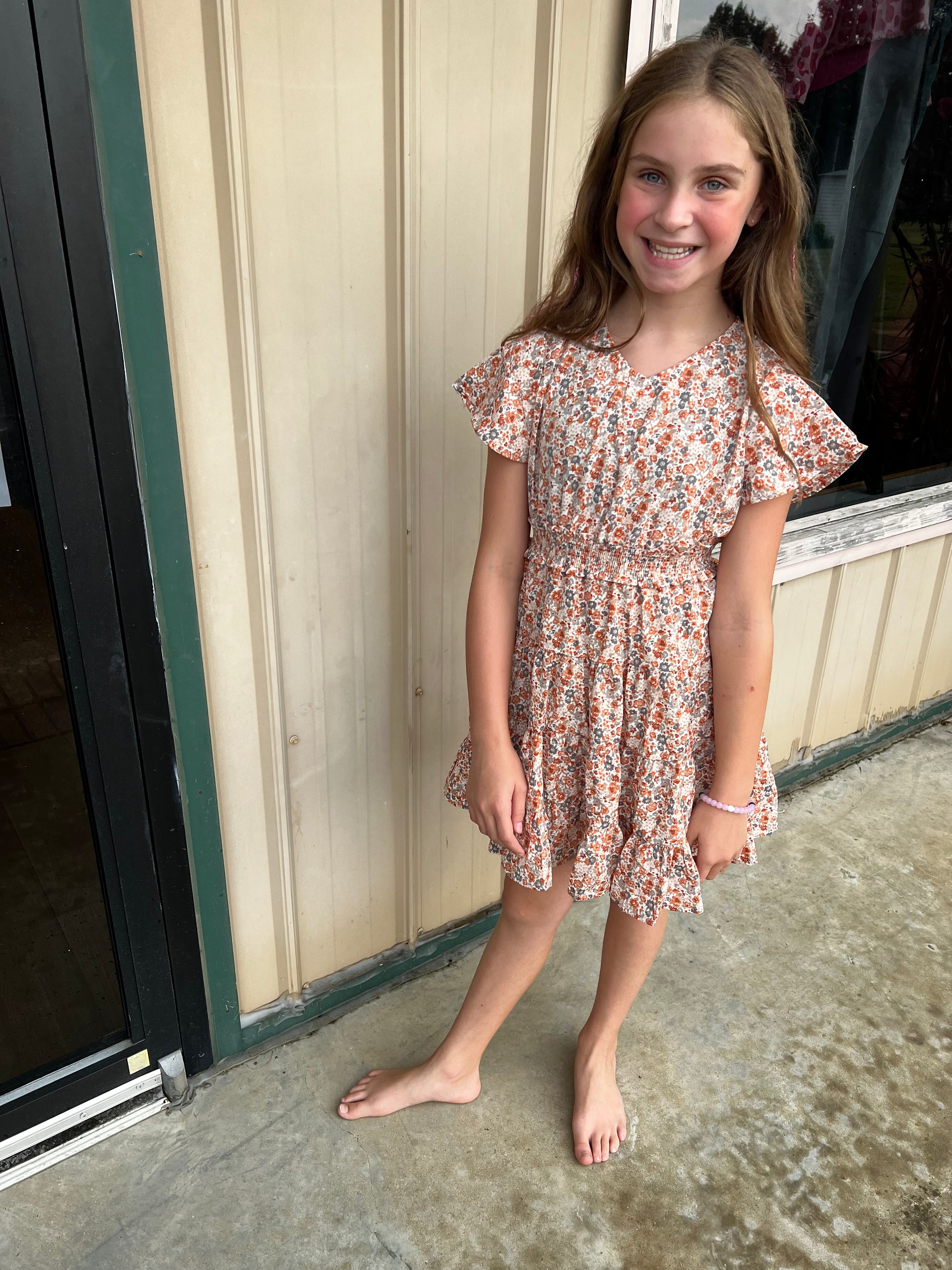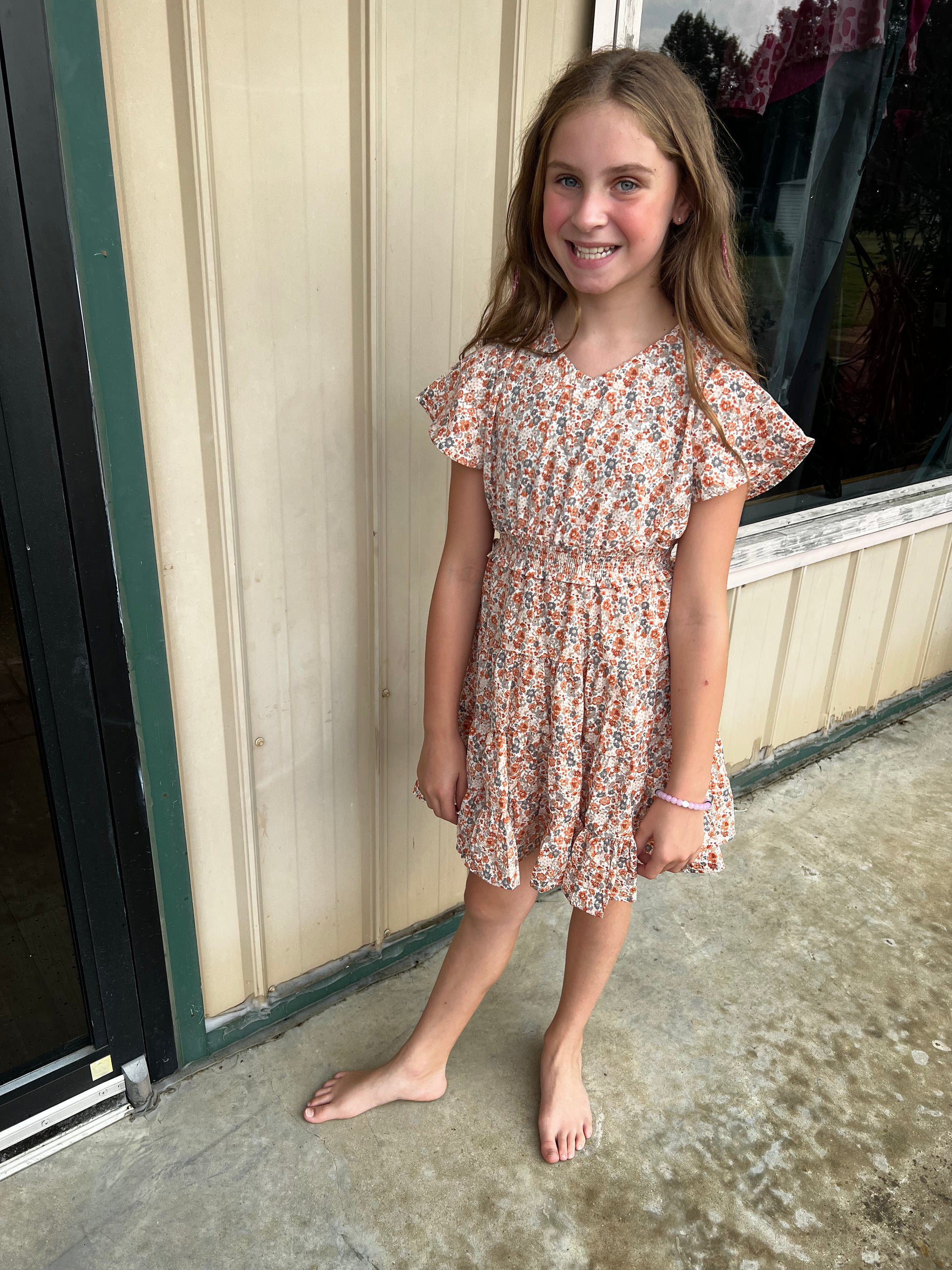 Girls Flutter Sleeve Smocked Waist V Neck Dress