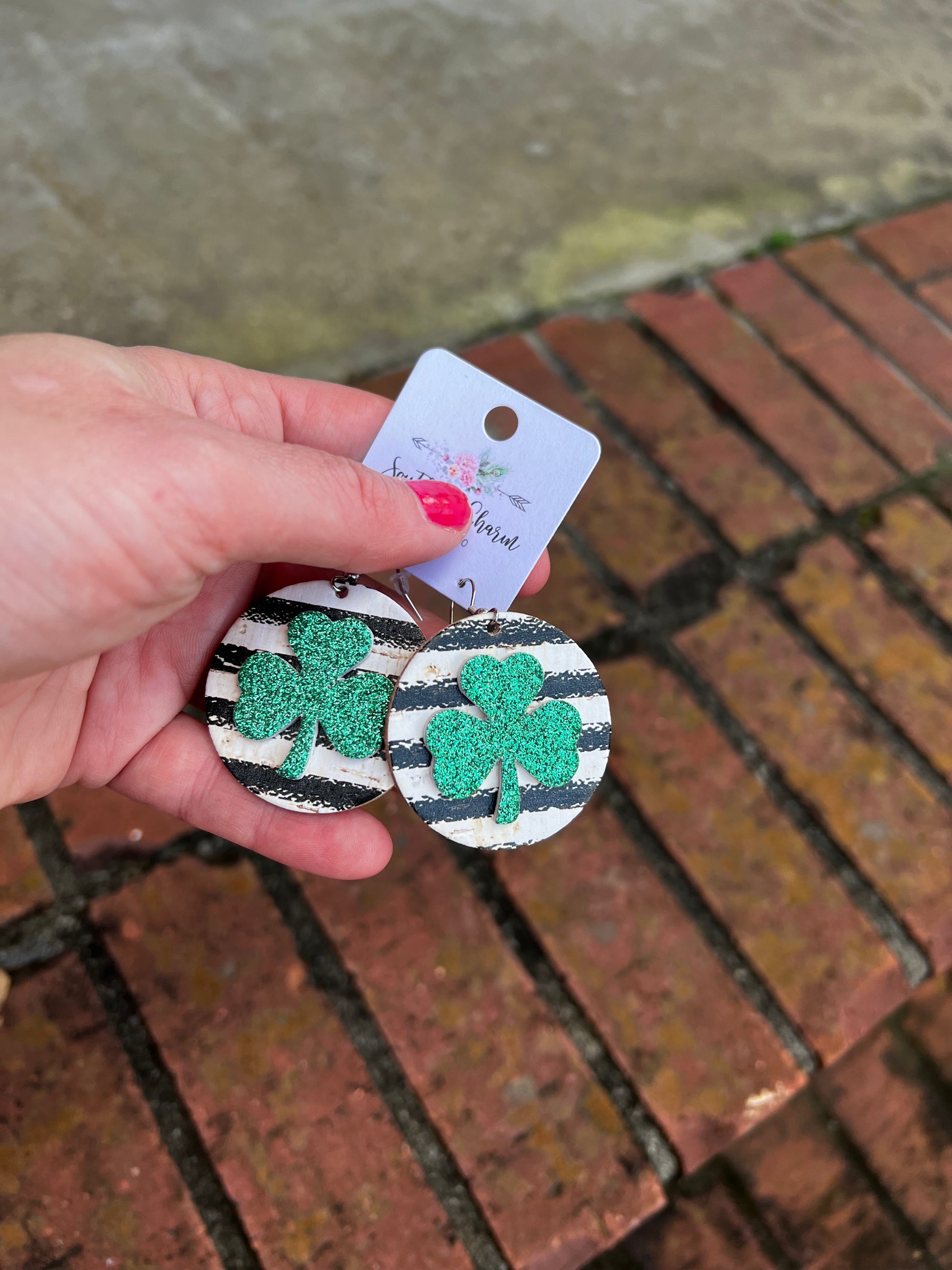 2" green glitter 3-d shamrocks on blurred lines circles.