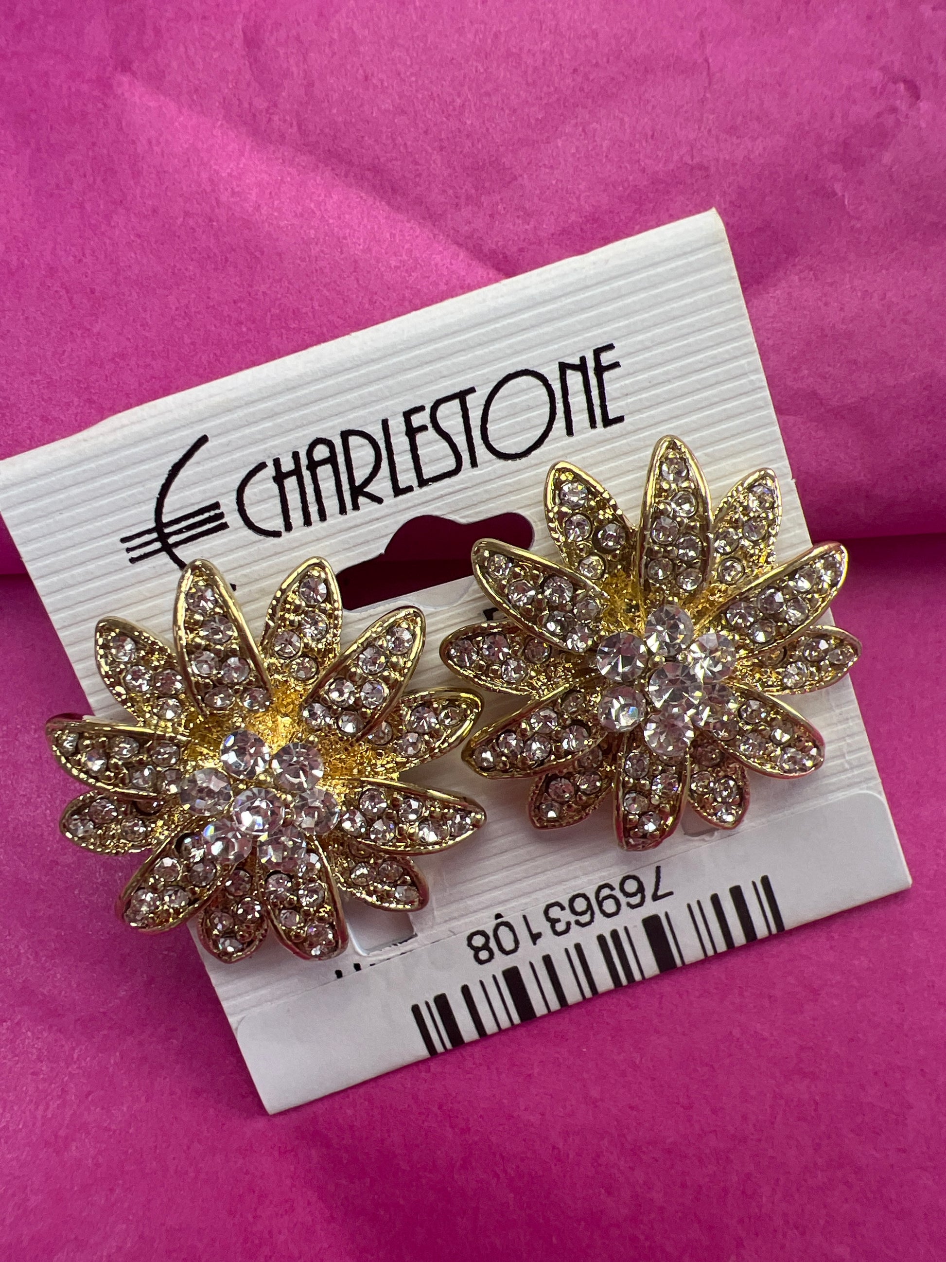 Gold Crystal Rhinestone Flower Shape Clip Earrings-24300c200