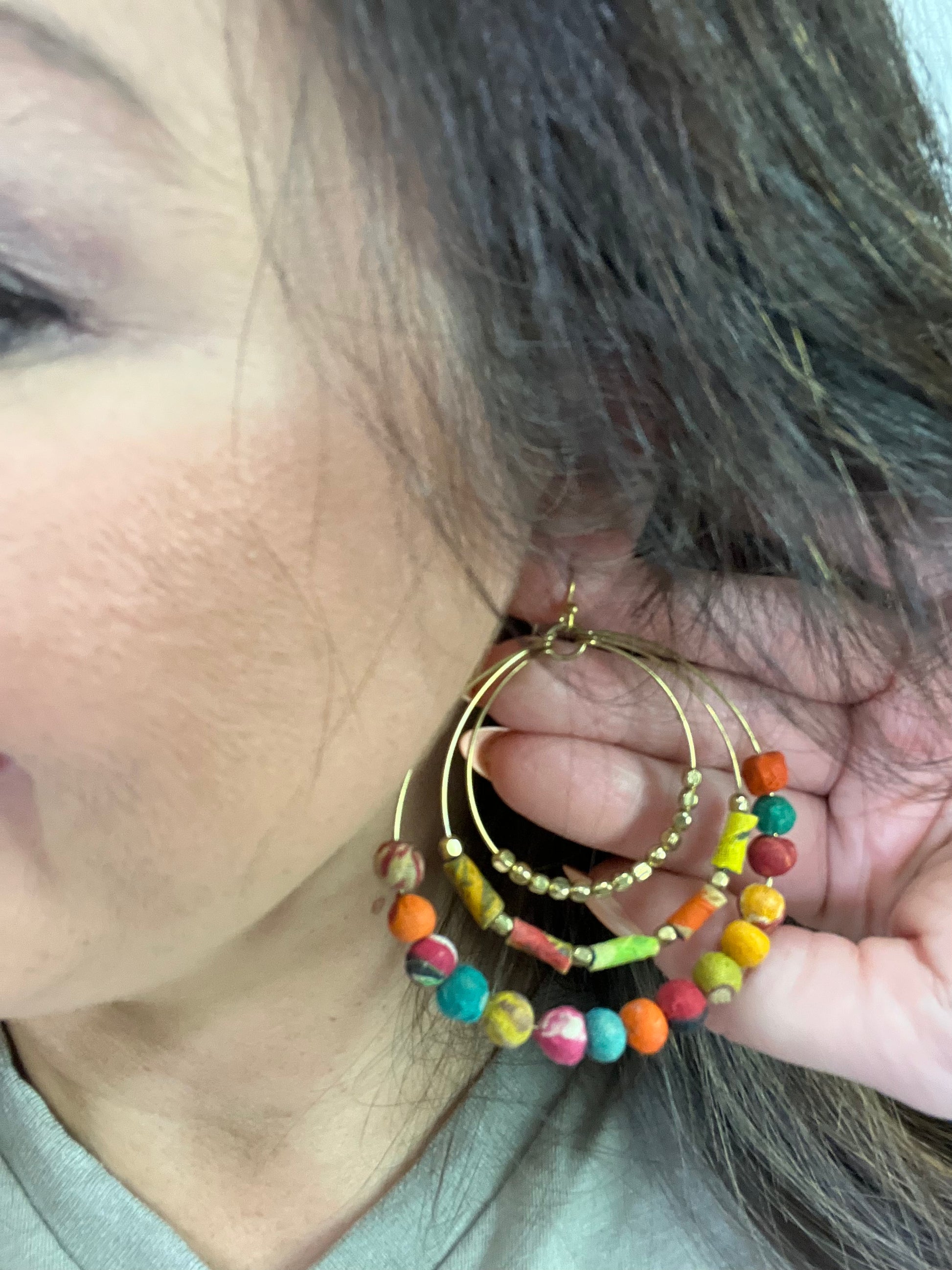 - Trendy triple hooped earrings with hand-wrapped cotton beads and metal beads.