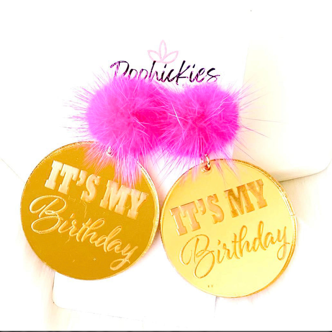 It’s My Birthday Acrylic Dangles, Hot Pink Puff