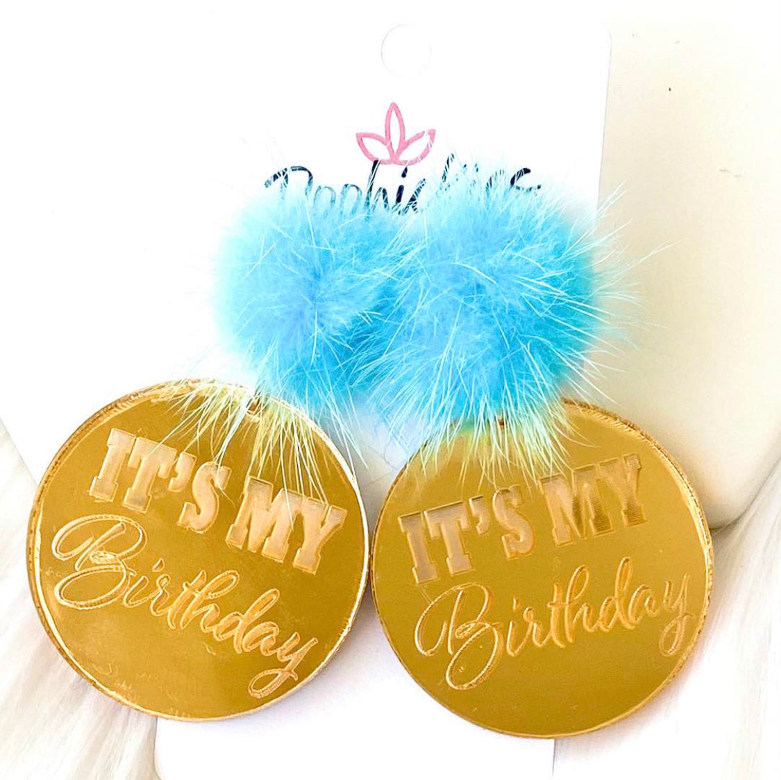 It’s My Birthday Acrylic Dangles, Teal Blue Puff