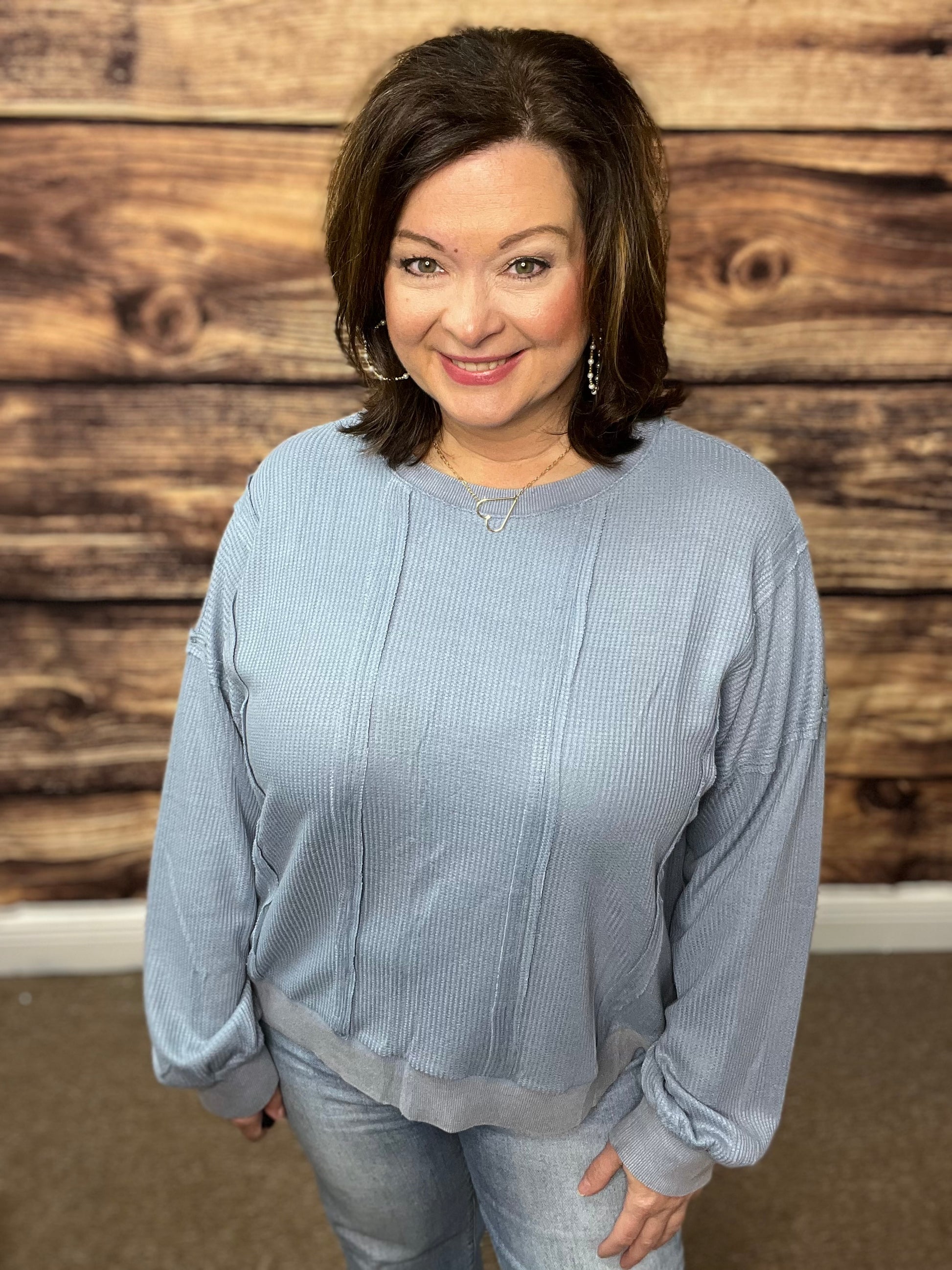 Acid washed thermal textured pullover with exposed seam details and relaxed fit.