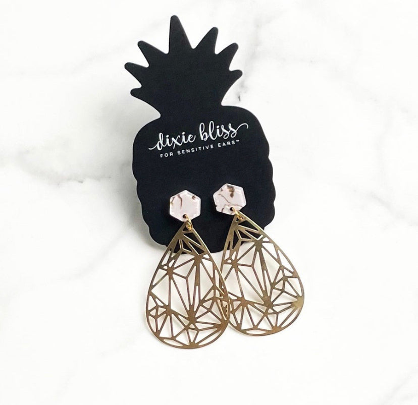 - Iridescent white and gold marble acrylic hexagon stud