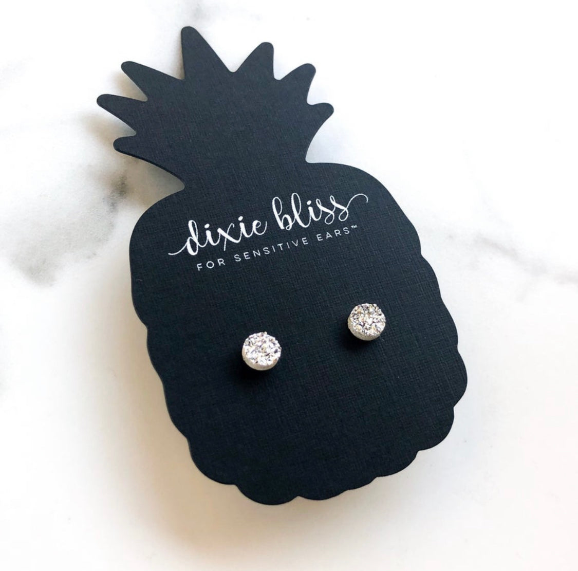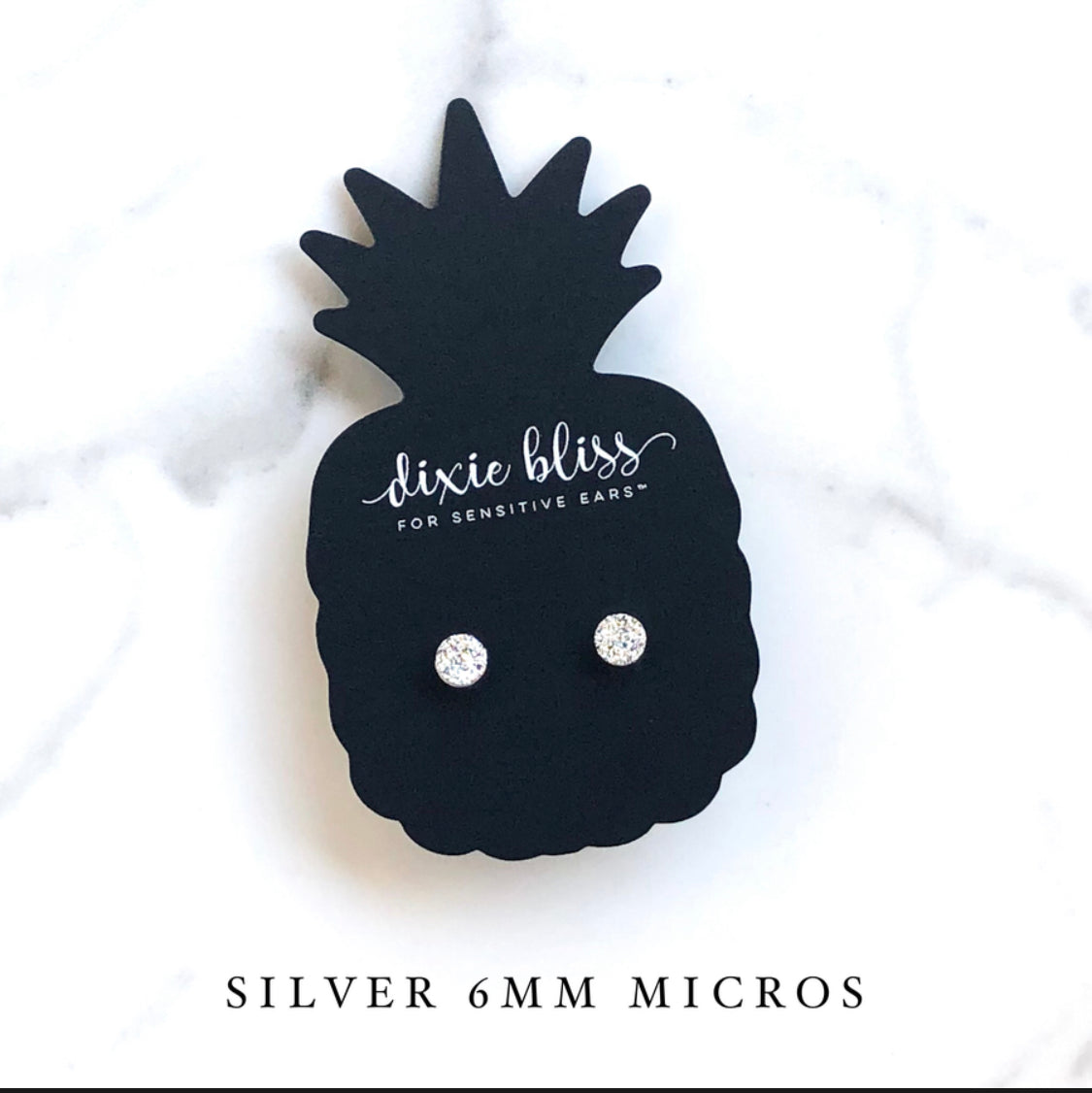 Introducing Micros in Silver: 6mm of pure glitz and glam! Get maximum sparkle with these dazzling faux quartzy druzy earrings, attached to hypoallergenic stainless steel posts. Trust us, your sensitive ears will thank you for it! So, be a sparkle queen and shine on with Micros in Silver!