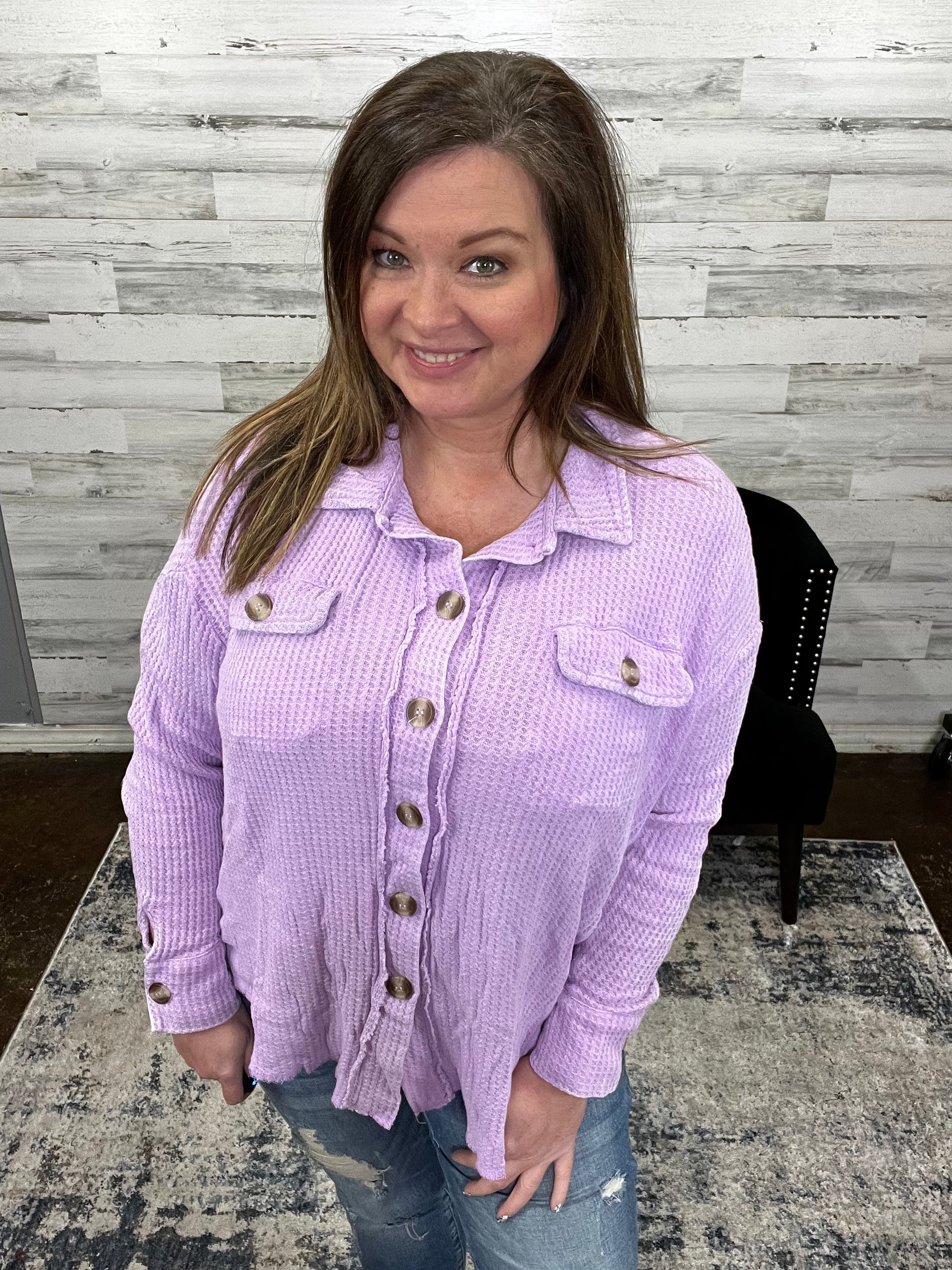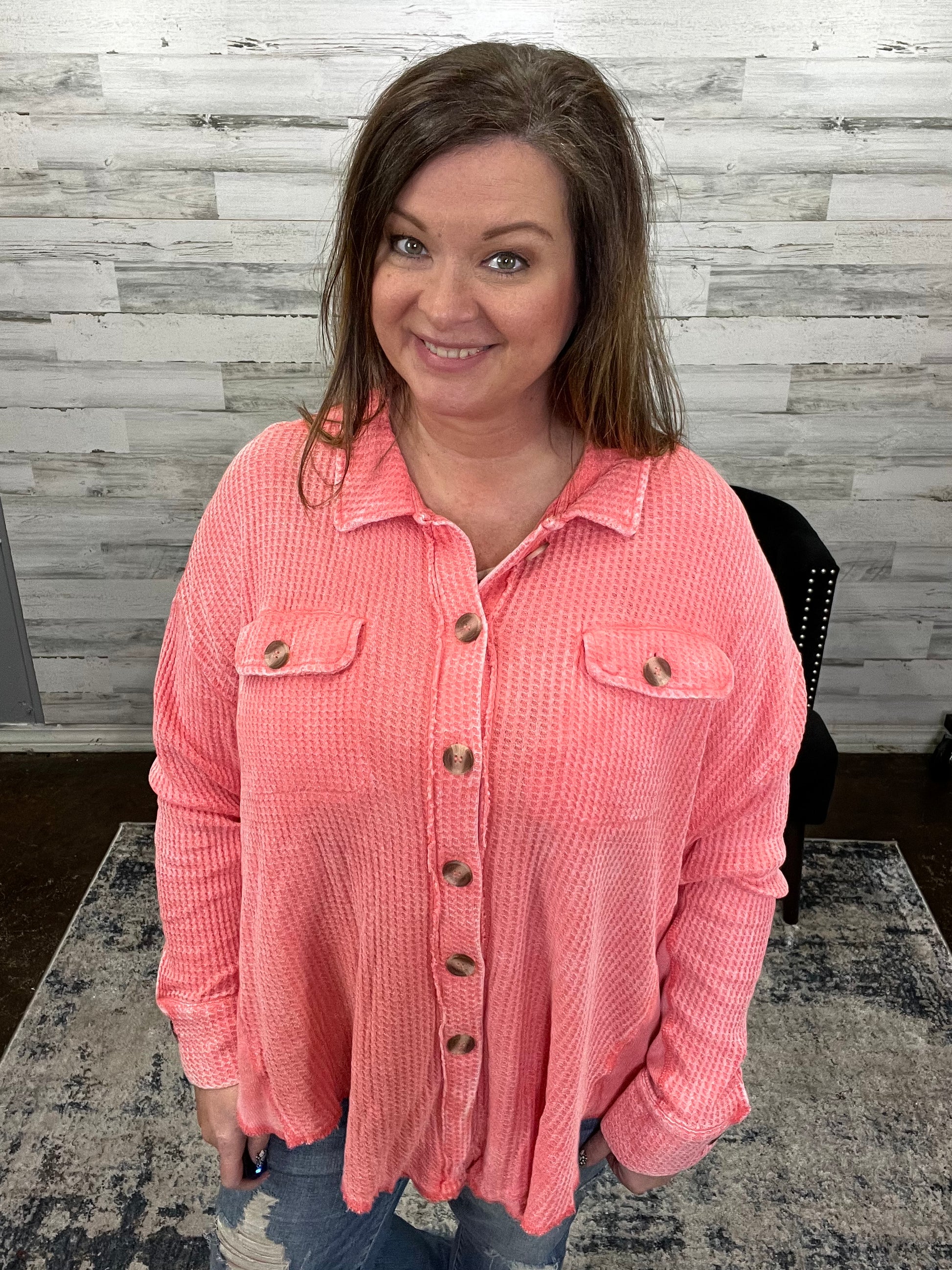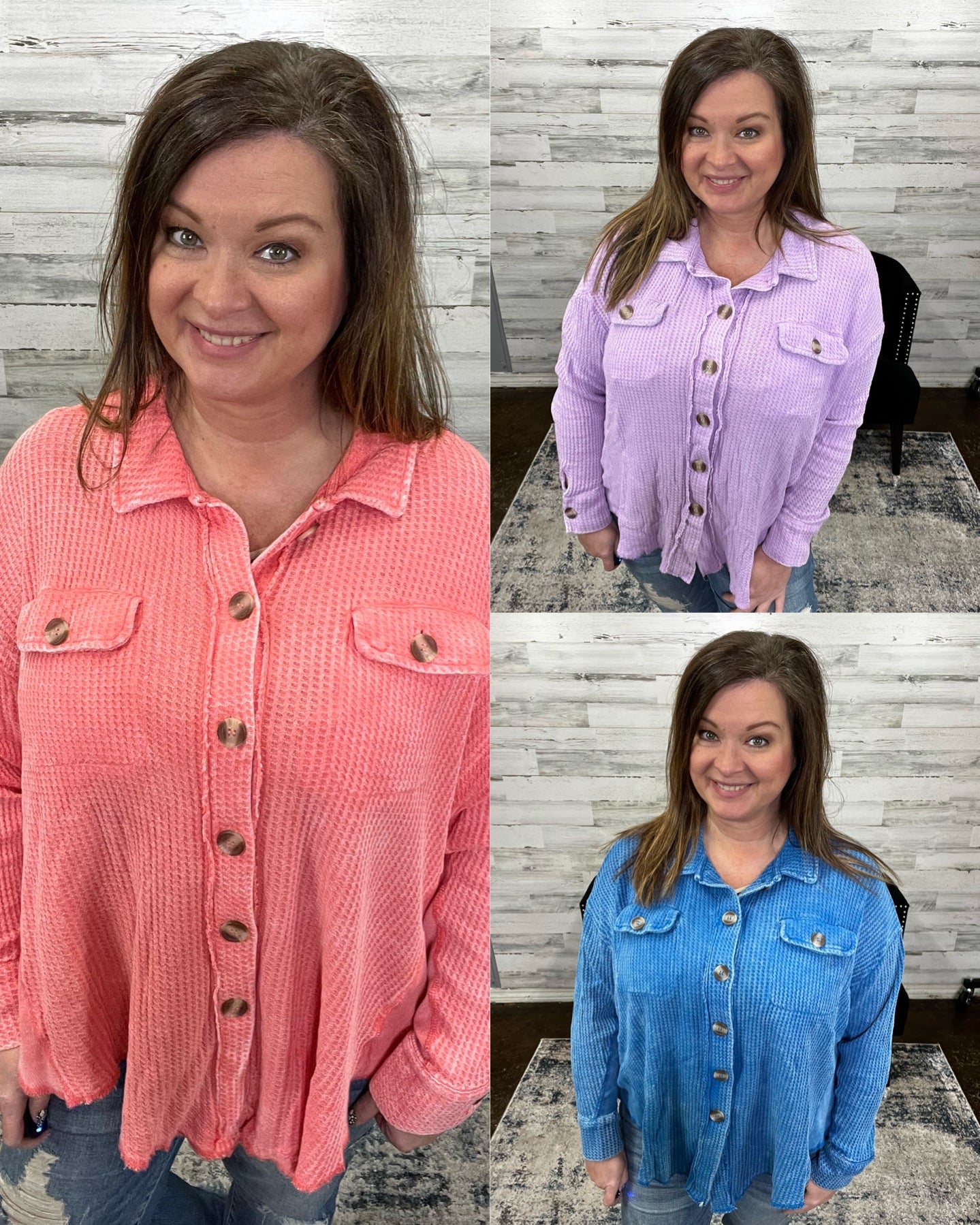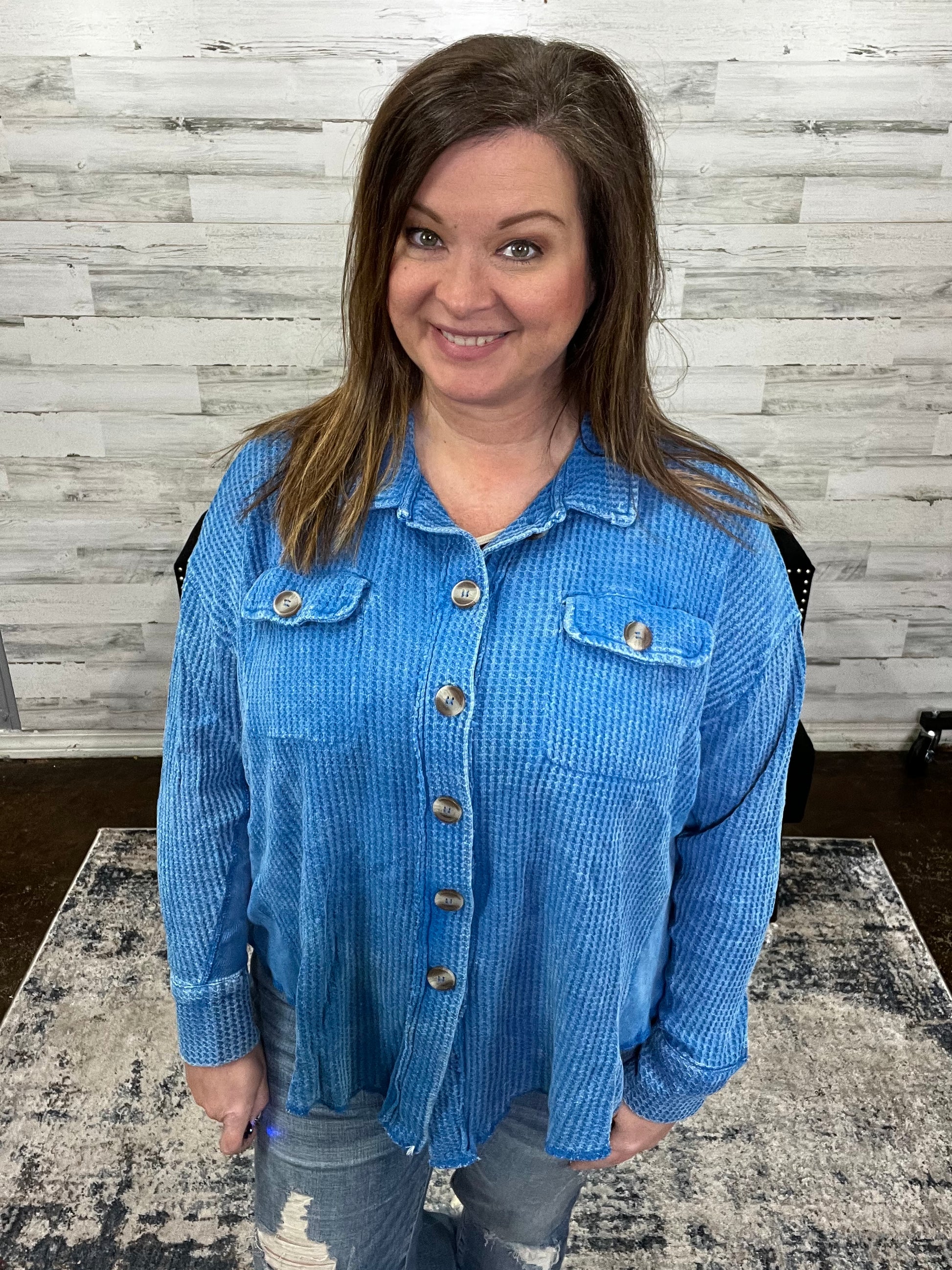 Stay stylish and comfortable in this Acid Wash Oversized Cotton Waffle Shacket. The hi-low hem and front button closure make it the perfect piece to layer and lounge- the never ending comfort you've been looking for! Let the comfort never end!