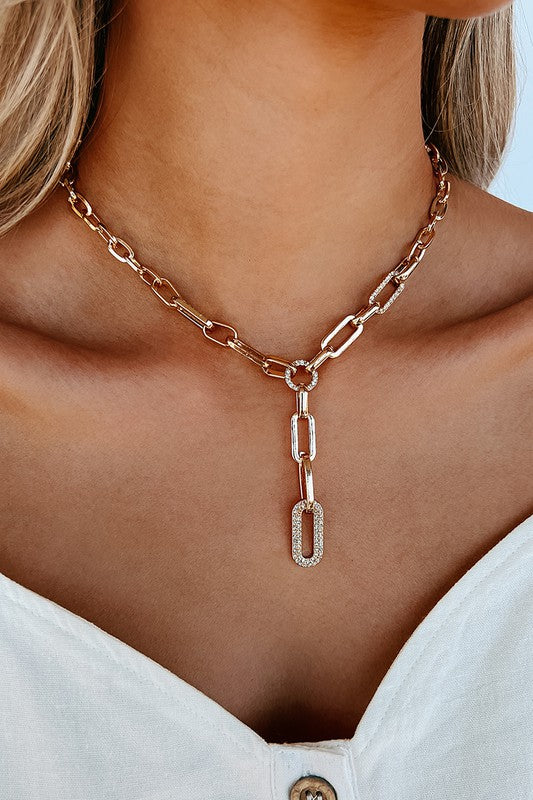 Gold Square Paperclip Chain Detail Rhinestone Detail Lariat Detail Bling Oval