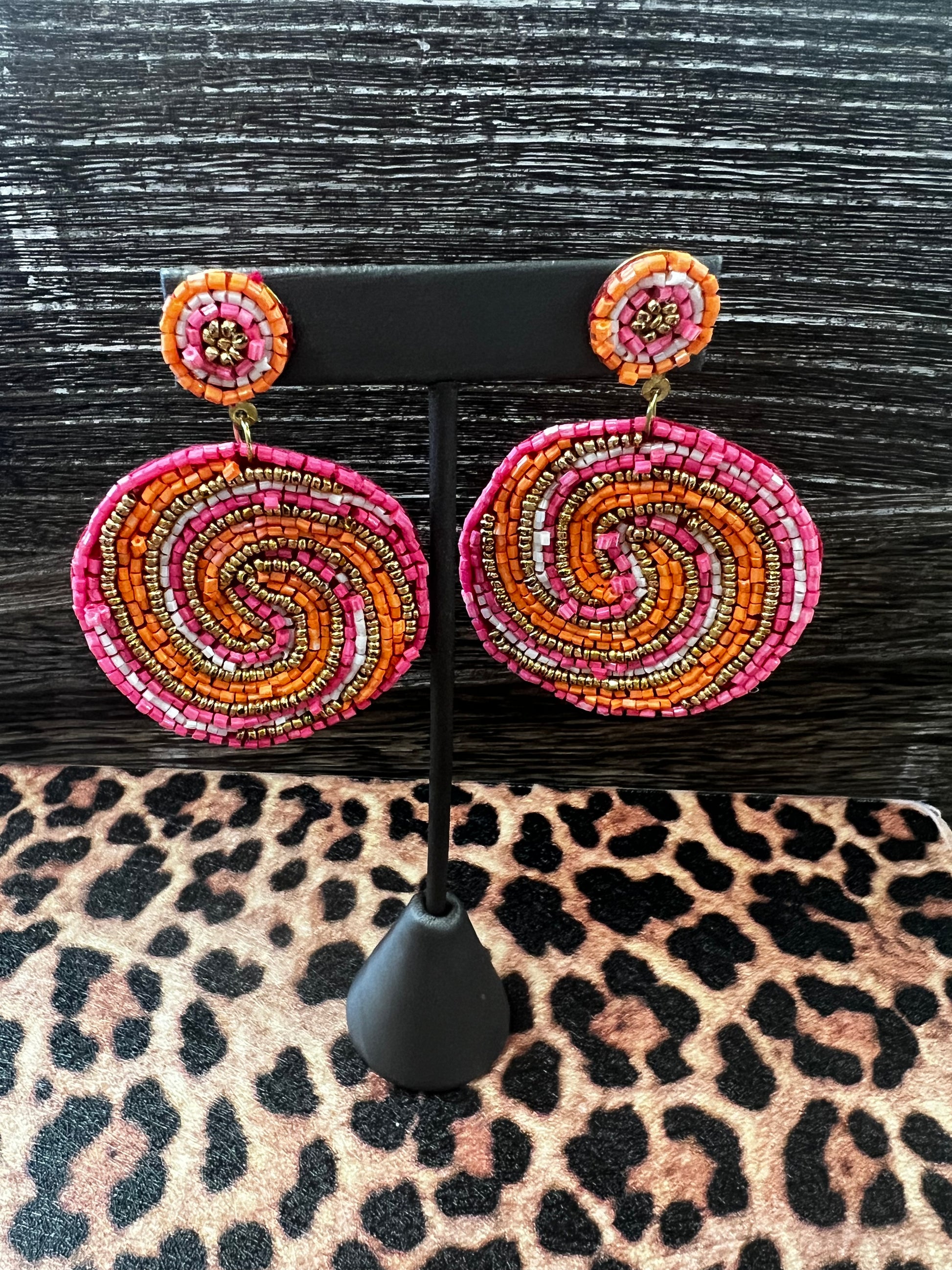Spiral Pattern Bead Disk Earrings, Fuchsia