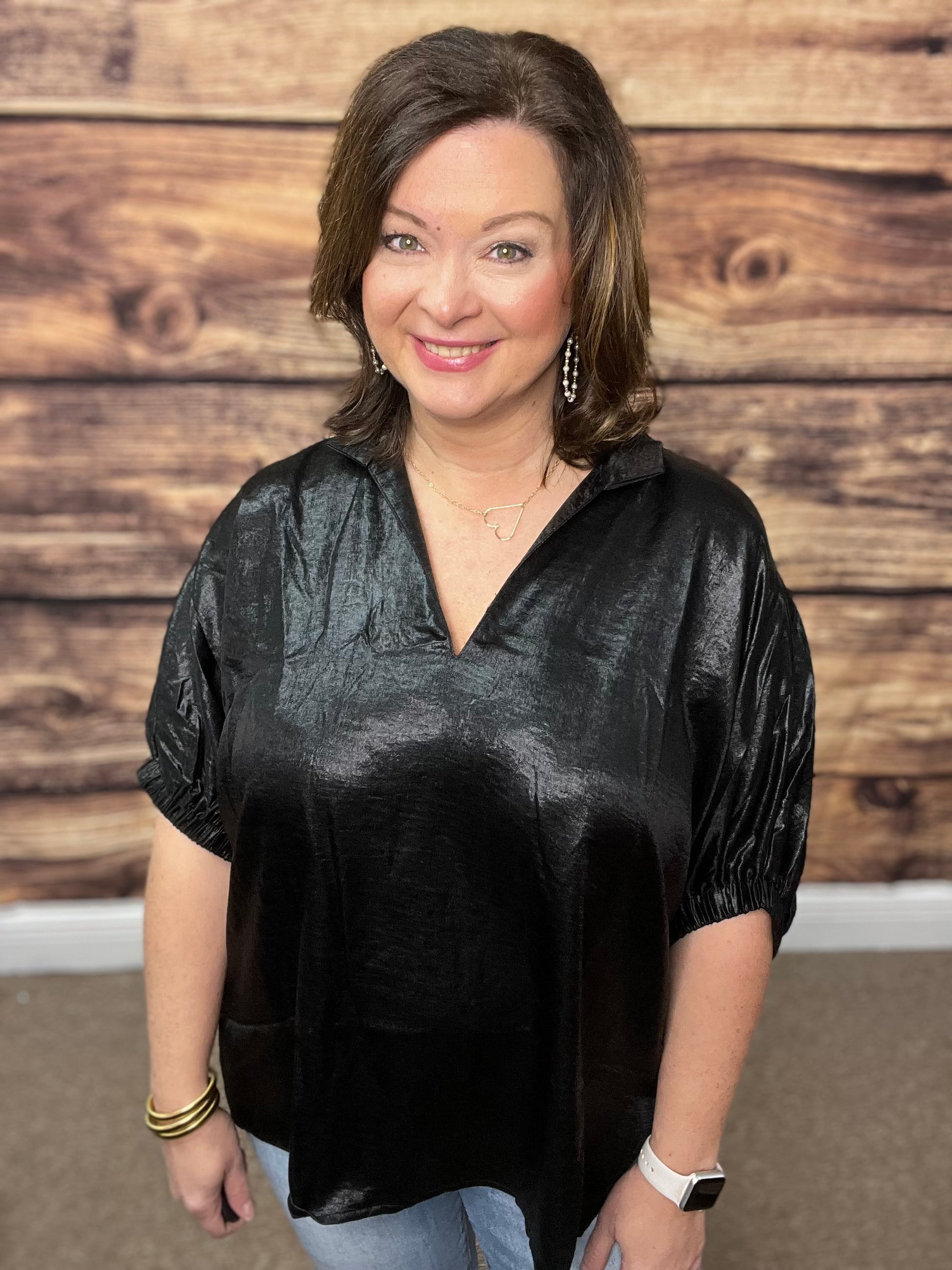 Metallic V-neck band collar short dolman sleeve top. Unlined. Woven. Non-sheer. Lightweight.